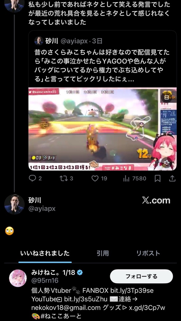 | … | 58無念Nameとしあき26/01/18(日)01:30:28No.1380915152+>そろそろ自分のクビはさくらみこのせいとか言い出すんじゃないかと思う |