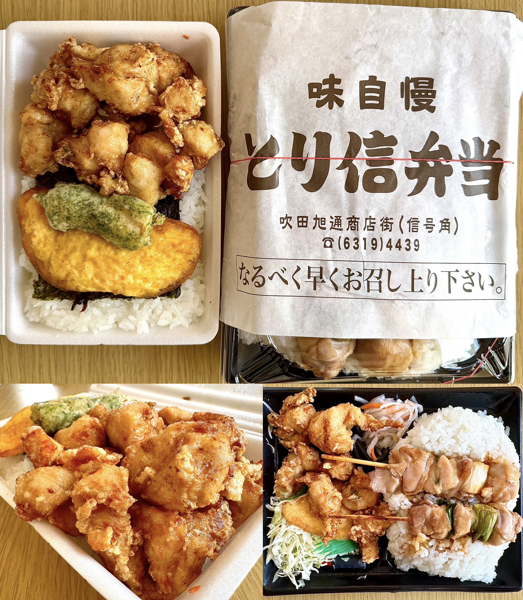 精肉店「とり信」の弁当🐓吹田のソールフード☝️なんと言っても絶品の名物唐揚げ🍗✨️のり弁当は唐揚げたっぷり‼️フタがしまらん😂海苔の下にはほぐした鮭フレーク🐟焼き鳥🍢ご飯に埋もれてる?甘いタレシュミシュミやで🤤弁当2個で腹パンパン??