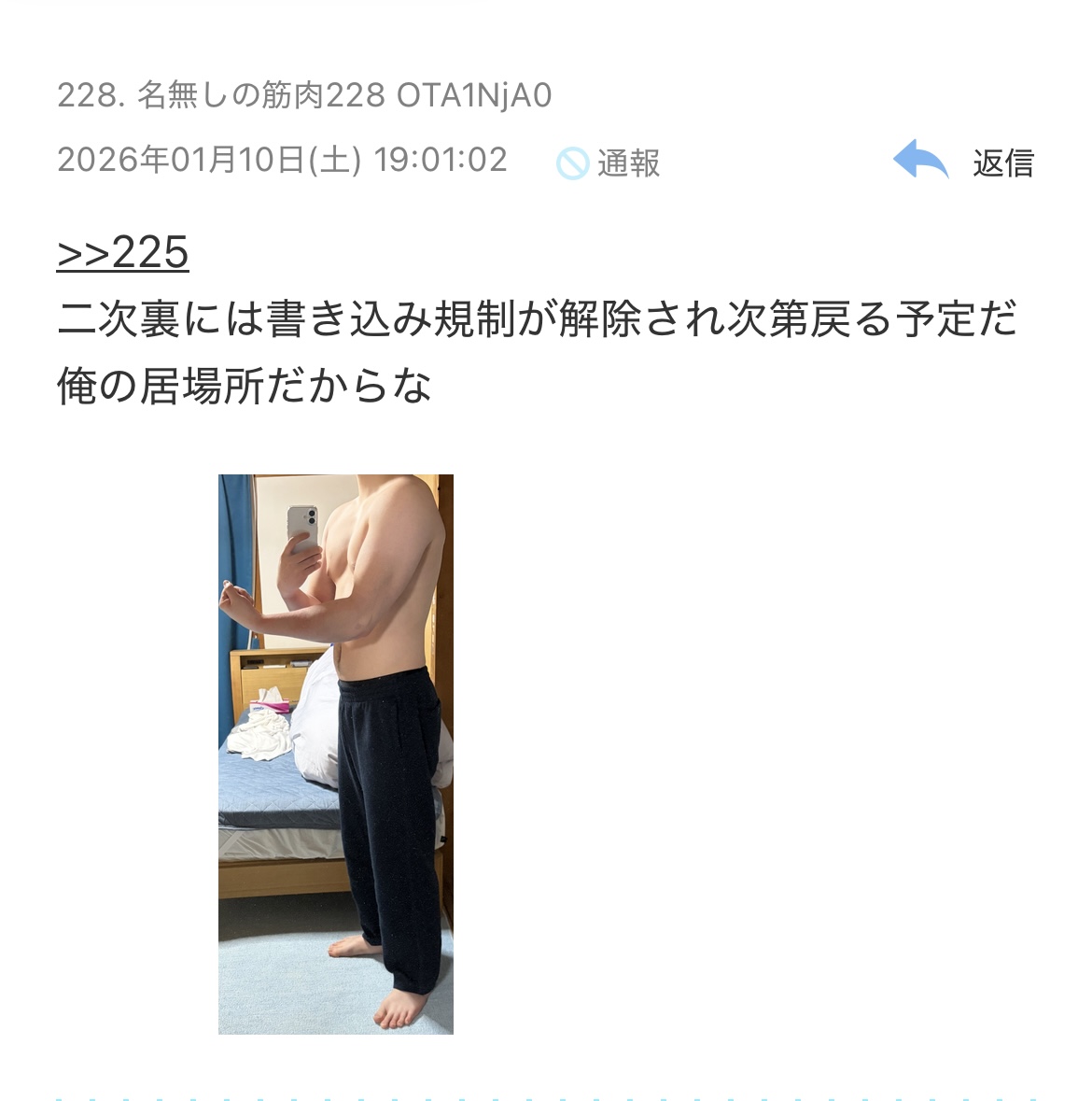 | … | 128無念Nameとしあき26/01/19(月)00:40:30No.1381192409+>懸垂アピールしてるのに何故か背中の写真を貼らない |