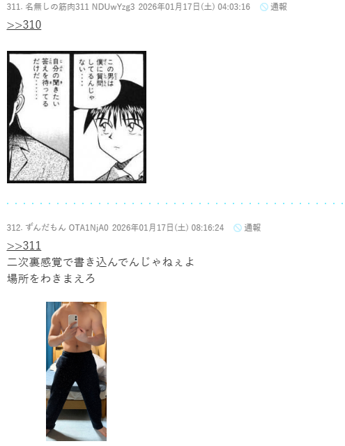 | … | 91無念Nameとしあき26/01/18(日)23:25:42No.1381175073+としあきが立てた「俺の体見てくれ」スレなのに乗っ取って筋トレスレにしちゃって筋トレ以外のレスすんなとか自治してる |