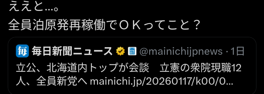 | … | 723無念Nameとしあき26/01/19(月)00:24:20No.1381189317+これ中核参加の立憲組の一人負けなんじゃないか? |