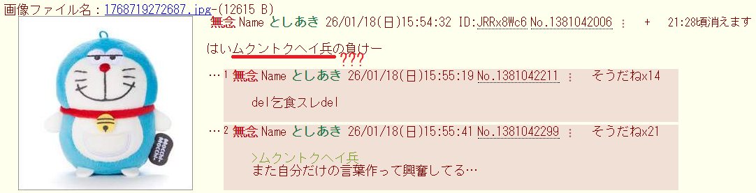 | … | 42無念Nameとしあき26/01/19(月)06:54:55No.1381211271+特定のスレで必ず使うワードが入ってるから正体バレバレなんだよね |