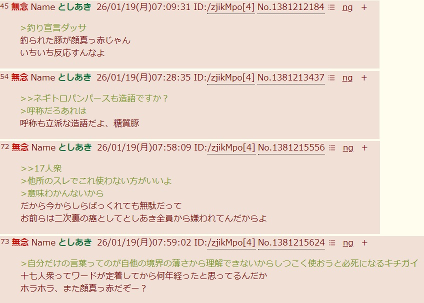 | … | 91無念Nameとしあき26/01/19(月)08:12:33No.1381216888+面白い造語見にきたのに罵倒しかここにはないのか |