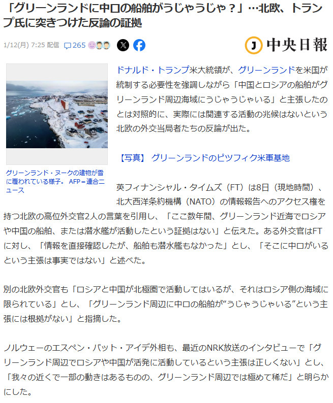 | … | 678無念Nameとしあき26/01/19(月)14:27:06No.1381266080そうだねx1>>グリーンランドが攻められそうになってるのになんで日本が安泰って前提になってんの? |