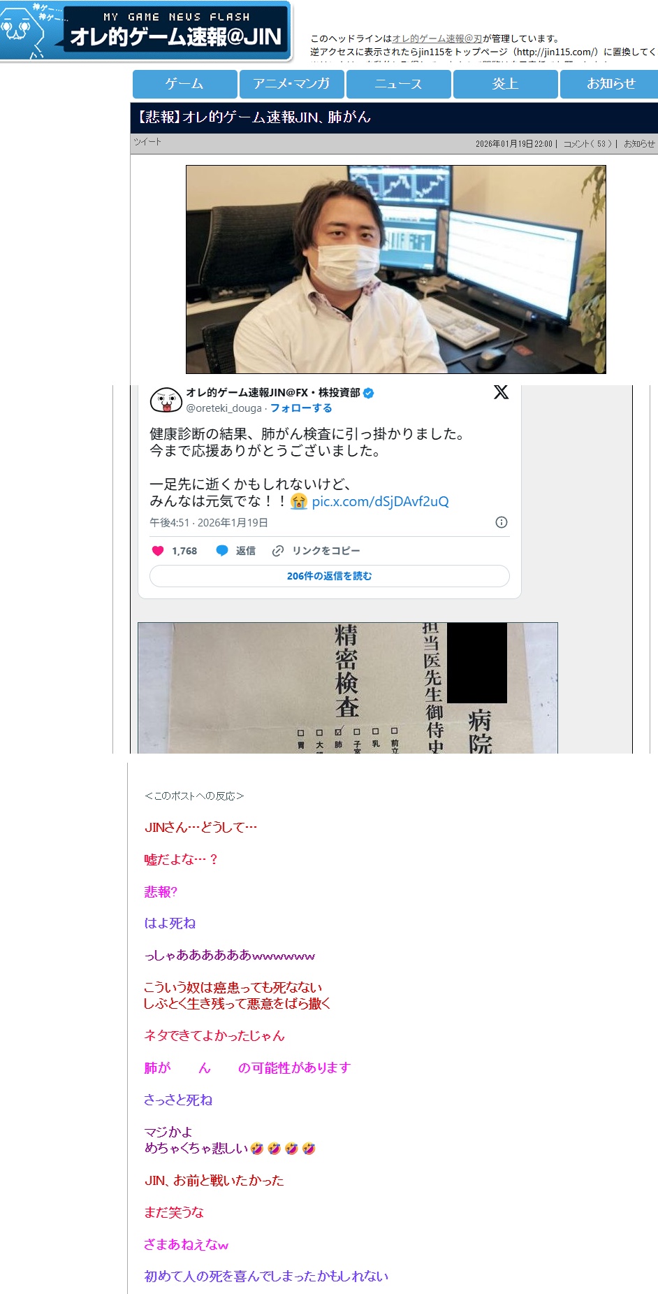 オレ的ゲーム速報JIN氏 肺がんで死ぬ予定削除された記事が1件あります.見る