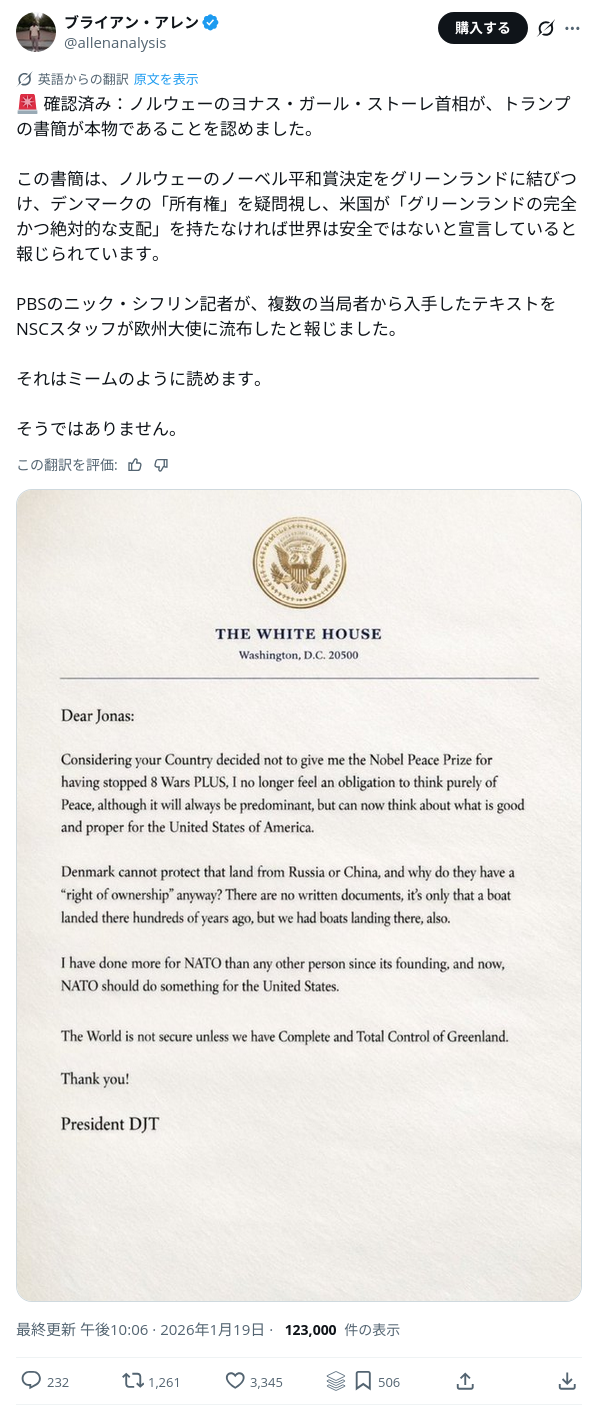 | … | 57無念Nameとしあき26/01/20(火)04:42:45No.1381420467+その中では「あなたの国が8つの戦争を止めた私にノーベル平和賞を授与しなかった以上、私はもう純粋に平和を考える義務を感じない」と表明。「平和は最優先事項だが、同時にアメリカにとって何が有益で適切かを考える」と伝えました。 |