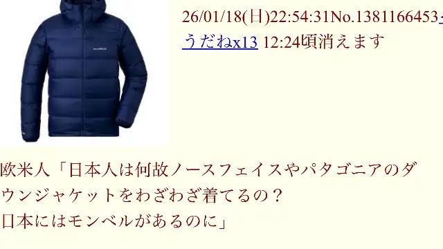 | … | 9無念Nameとしあき26/01/20(火)00:19:36No.1381401219+北に住んでなきゃ綿ダウンで十分 |