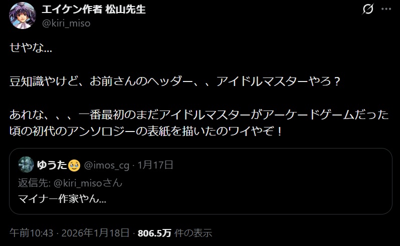 | … | 134無念Nameとしあき26/01/20(火)08:40:59No.1381433581そうだねx1>そういや反AIがエイケンの作者に「マイナー作家」とかいって噛みついて炎上してたな |