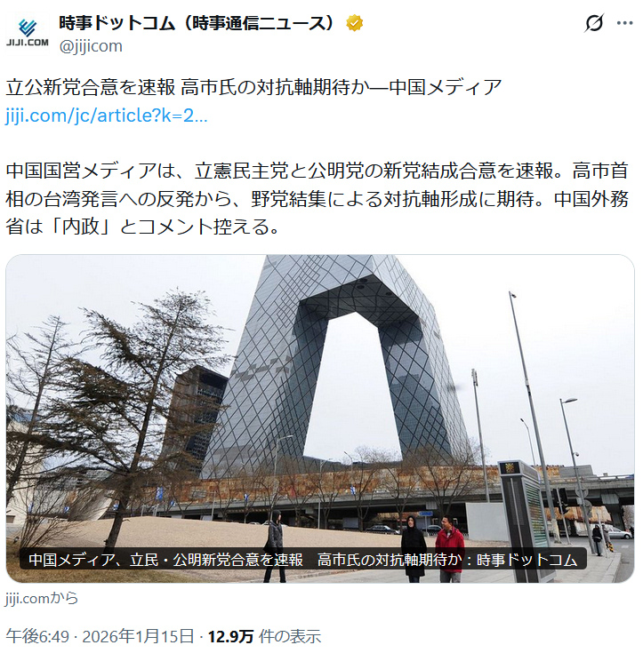 | … | 80無念Nameとしあき26/01/20(火)13:45:55No.1381478000そうだねx3>中国共産党、日本の中革連支持を表明 |