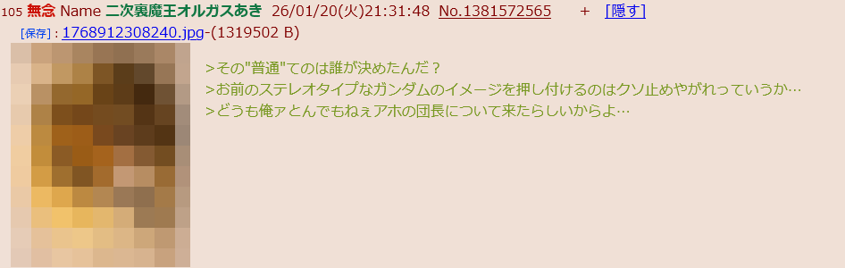 | … | 84無念Nameとしあき26/01/20(火)21:06:38No.1381565565+>その"普通"てのは誰が決めたんだ? |