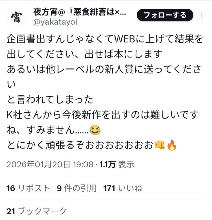 | … | 11無念Nameとしあき26/01/20(火)21:26:58No.1381571277そうだねx7>「あるいは他レーベルの新人賞に送ってください」だから、もううちでは扱いません宣言なのかなこれは |