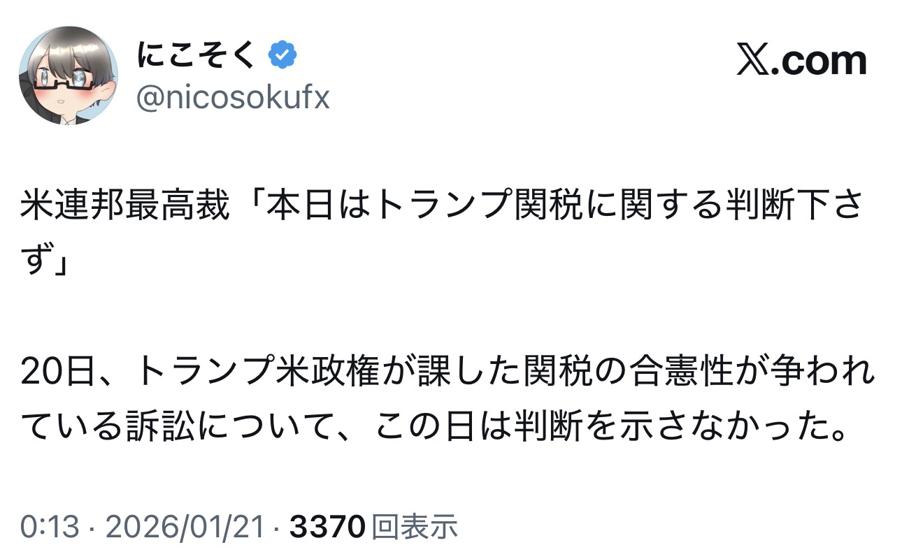 | … | 71無念Nameとしあき26/01/20(火)22:37:15 ID:eoHPUqyQNo.1381589674そうだねx3>トランプ関税に関する最高裁判例が出るぞ出るぞ詐欺やめろのd |