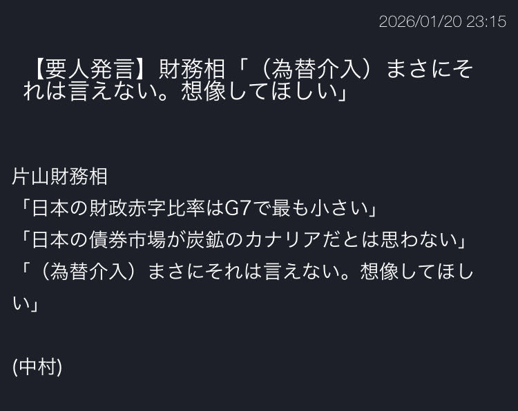 | … | 758無念Nameとしあき26/01/21(水)00:41:28 ID:eZid2hp.No.1381615859+為替市場の変動に対しての物言いに比べて |