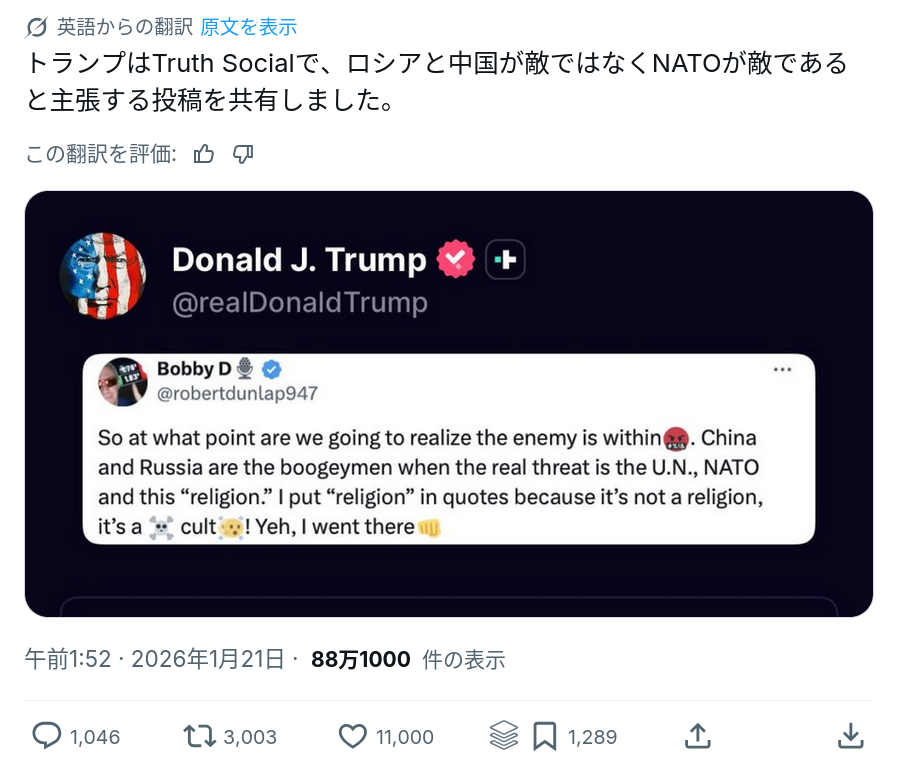 | … | 799無念Nameとしあき26/01/21(水)11:47:57No.1381665556+>ちなみにトランプの現状のNATOへの認識 |