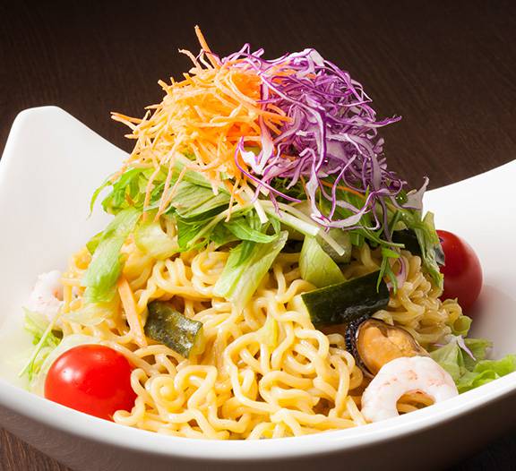 今、高級なラーメンショップで高級なラーメンサラダ食べてる