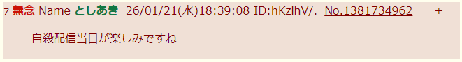 | … | 7無念Nameとしあき26/01/21(水)18:39:08 ID:hKzlhV/.No.1381734962+書き込みをした人によって削除されました |
