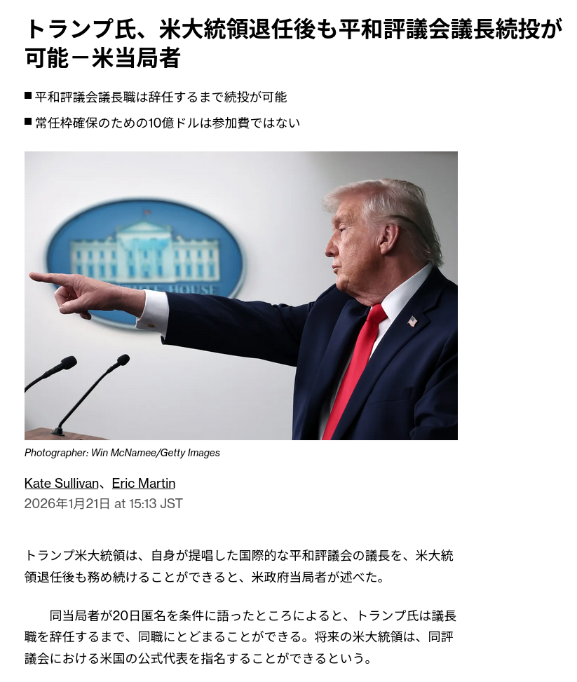 | … | 43無念Nameとしあき26/01/21(水)19:31:58No.1381748381そうだねx3ガザ平和評議会でトランプ氏から高市首相に招待状 参加期間3年超で10億ドル拠出要請か |