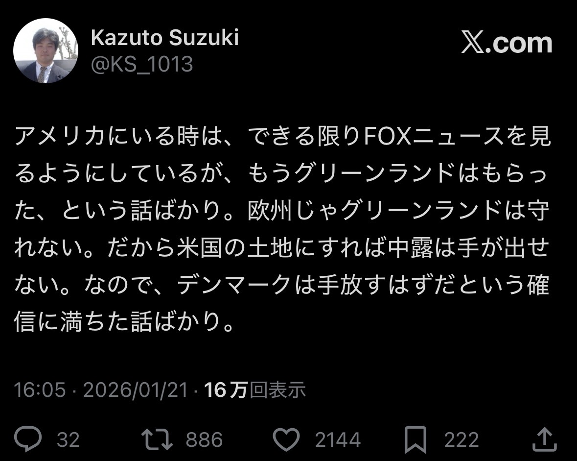 | … | 491無念Nameとしあき26/01/21(水)21:17:11No.1381780652そうだねx1ロシア「グリーンランドははロシアにとってのクリミア的存在だからアメリカが所有すべき」 |