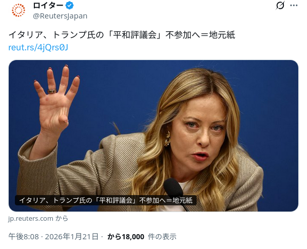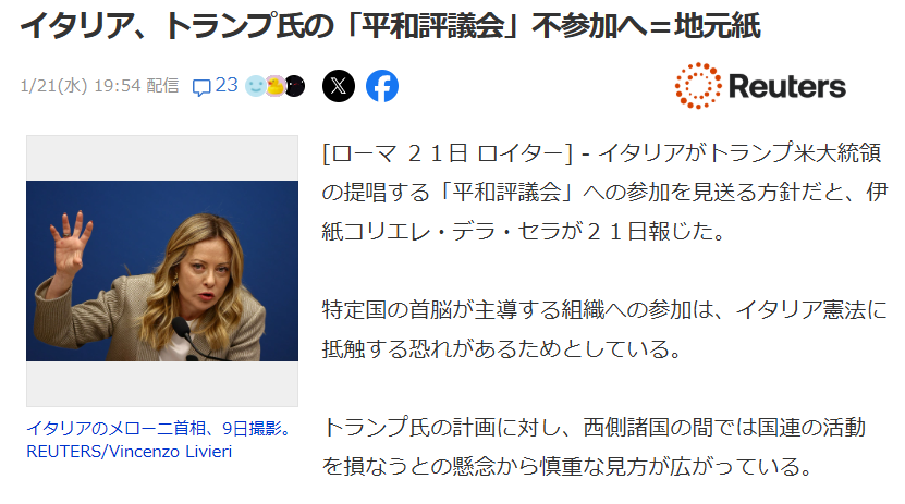 | … | 568無念Nameとしあき26/01/21(水)21:28:21No.1381784361+>イタリアも不参加か |