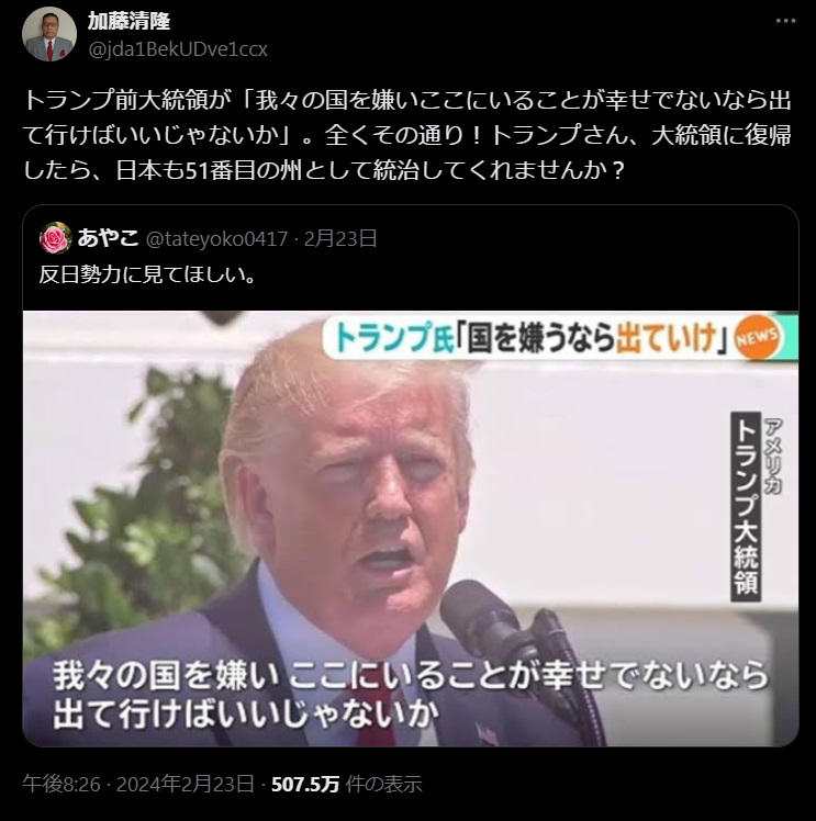 | … | 570無念Nameとしあき26/01/21(水)21:28:39No.1381784454+>負けた選挙を議事堂に殴りこんでひっくり返そうとした奴だぜ? |