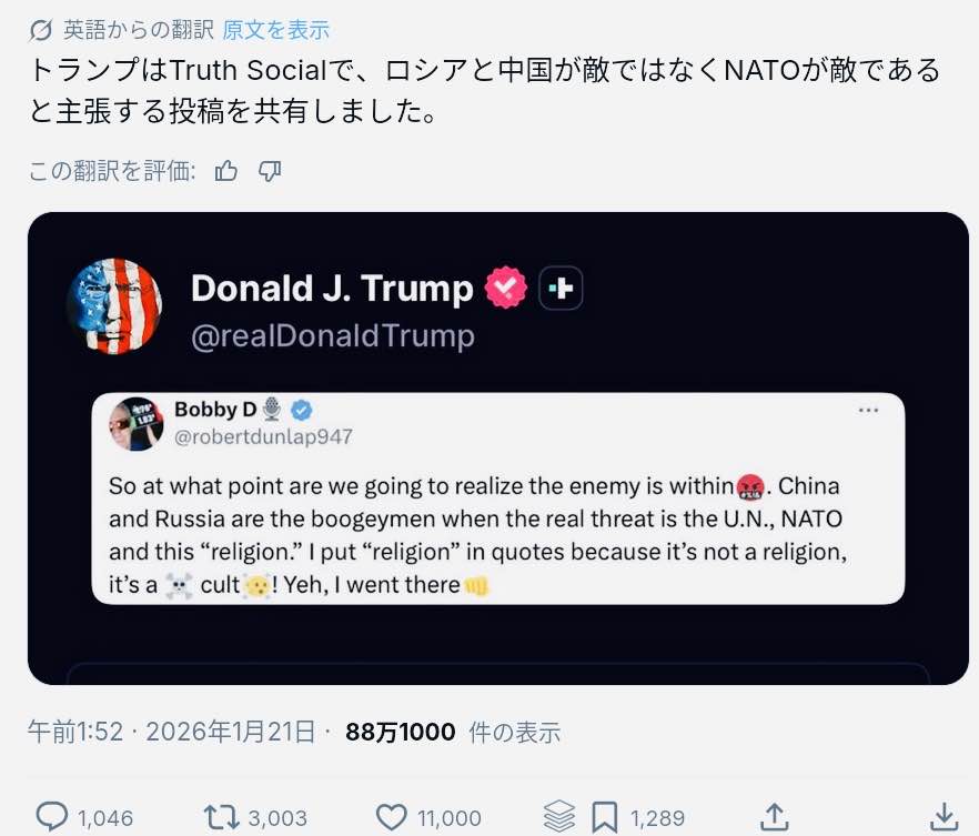 | … | 474無念Nameとしあき26/01/21(水)21:14:49No.1381779888+ロシアがトランプ太鼓持ちに入ってきたのがやばい |