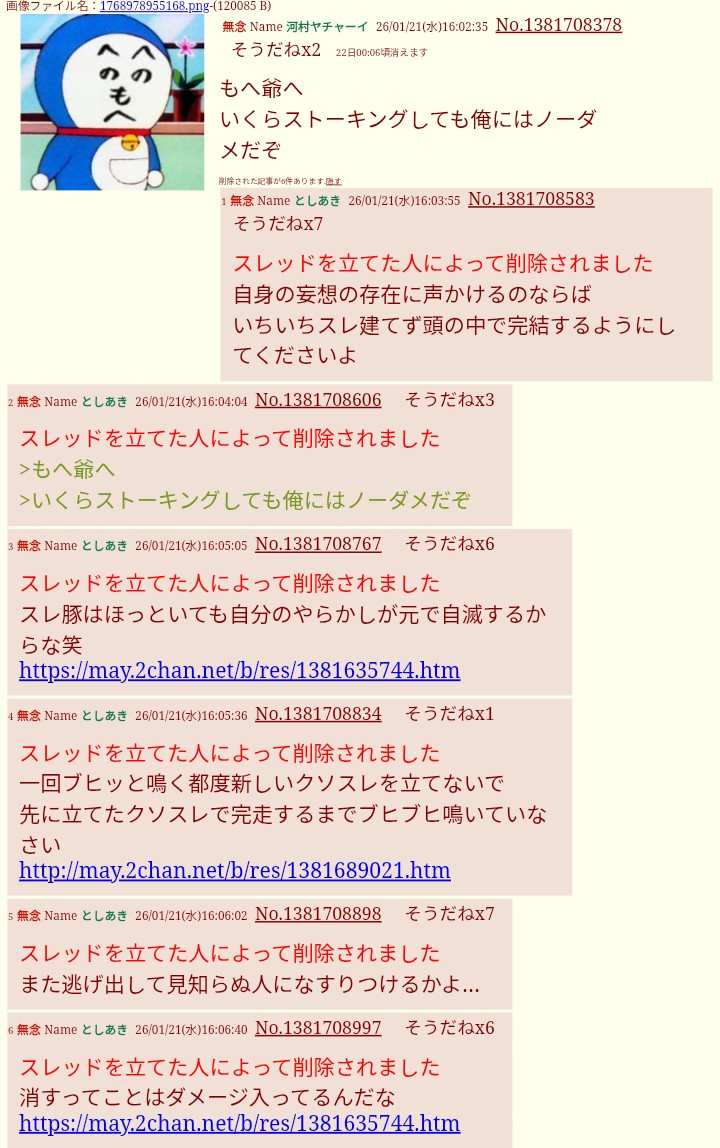 | … | 4無念Nameとしあき26/01/21(水)19:15:20No.1381743906そうだねx1犯罪者が立てたスレdel |