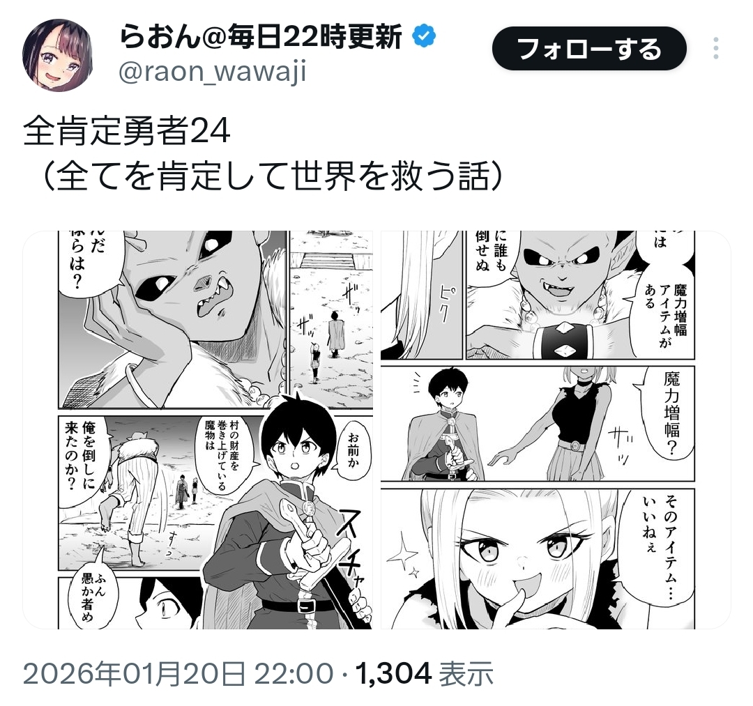 | … | 776無念Nameとしあき26/01/21(水)21:26:06No.1381783635そうだねx1言ってしまえば全肯定勇者描いてるのも完全に無駄行動なんだよな |