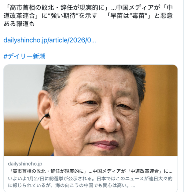 | … | 37無念Nameとしあき26/01/24(土)04:46:29No.1382271132+>中国的には安倍の再来恐怖みたいね |