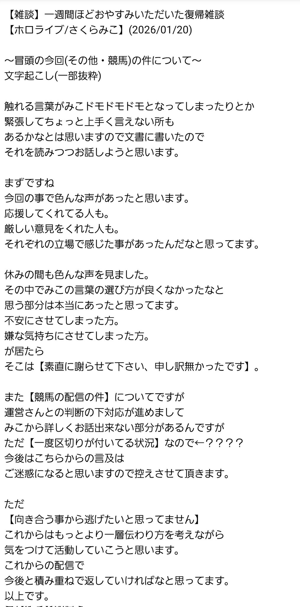| … | 10無念Nameとしあき26/01/24(土)16:01:14No.1382365674そうだねx2休み日の間もいろんな声を見ました。 えー、その中でみこの言葉の選び方が良くなかったなと思う部分は本当にあったと思ってます。 不安にさせてしまった方、嫌な気持ちにさせてしまった方がいたら、そこは素直に謝らせてください。申し訳なかったです。 また、えー、競馬の配信の件についてですが、運営さんの、運営さんとの判断のもと対応が進めまして、えー、みこからお話しできない部分があるんですが、ただ一度区切りがついている状況なので、今後はこちらからの言及はご迷惑にもなると思いますので、控えさせていただきます。 ただこう、向き合うことから逃げたいと思ってません。 これからはもっとより一層、伝わり方を考えながら気をつけて活動していこうと思います。 これからの配信で今後と、ま、積み重ねで返していければなと思ってます。 |