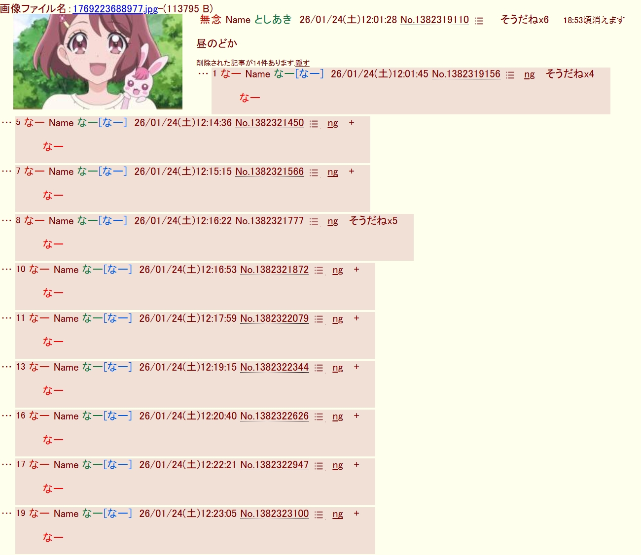 | … | 192無念Nameとしあき26/01/24(土)19:05:31No.1382406522そうだねx4>なんかスレ画の影響もあるだろうけど午前中に立てるスレは恒常的にdel喰らってそうですね… |