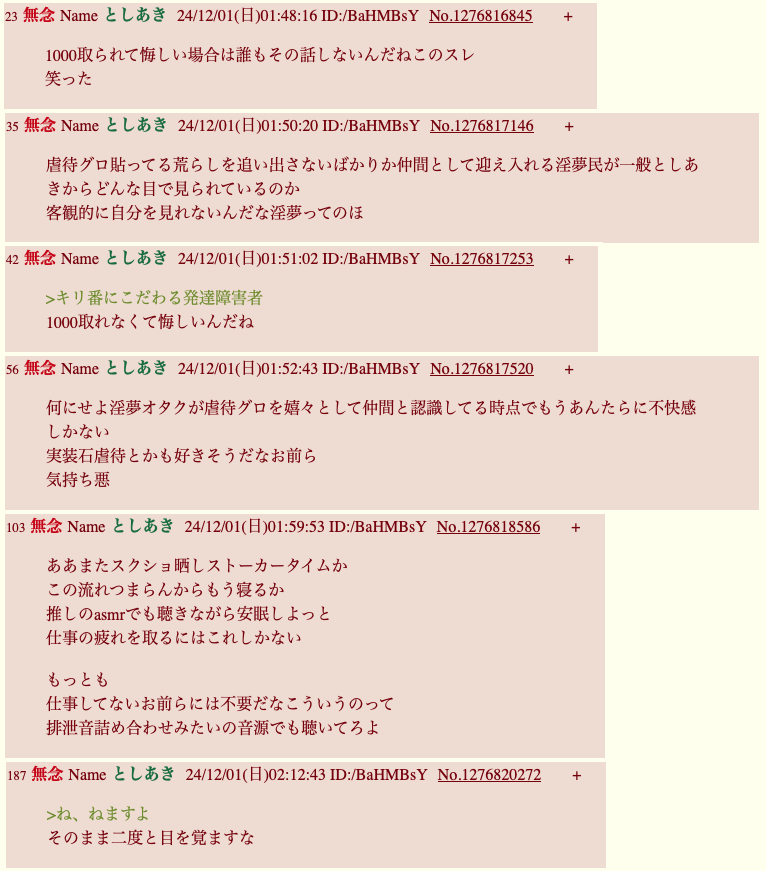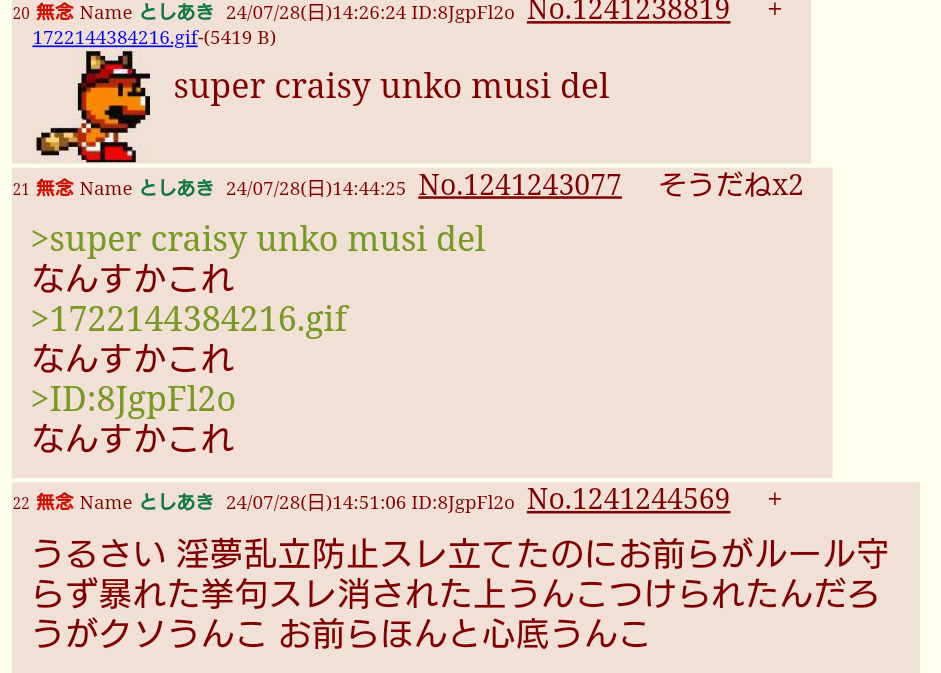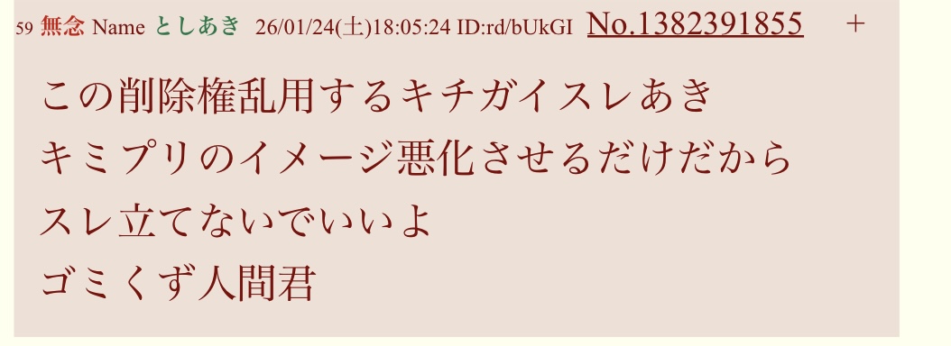 | … | 99無念Nameとしあき26/01/24(土)17:49:30No.1382388230+荒らしのレスが消されるのは当然では? |