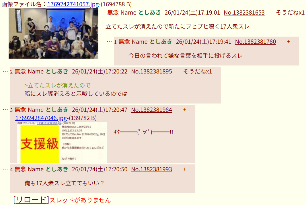 | … | 4無念Nameとしあき26/01/24(土)17:25:32No.1382382985そうだねx3キチガイさんさっきのスレなんで消したの? |