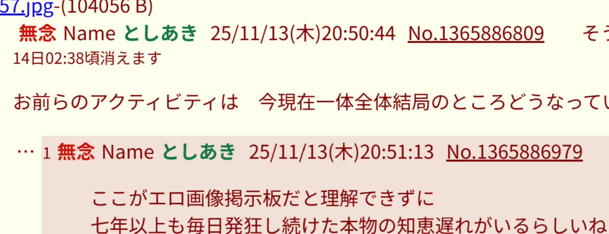 | … | 9無念Nameとしあき26/01/25(日)19:14:11No.1382673140そうだねx3自演しかできない嘘つきの卑怯者スレ虫 |