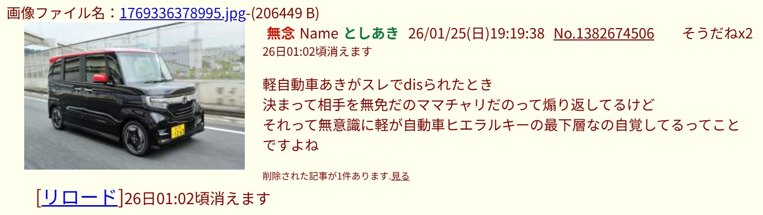 | … | 23無念Nameとしあき26/01/25(日)19:24:57No.1382675840そうだねx1>スレあきには関係ない車の話題なんでこんなにしつこいん? |