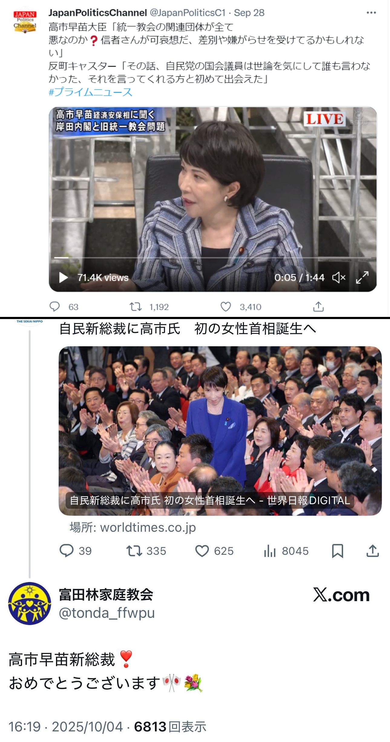 | … | 276無念Nameとしあき26/01/26(月)21:42:07No.1382921670+自民がカルトに支配されてんだか(あっさり解散命令出すけど) |