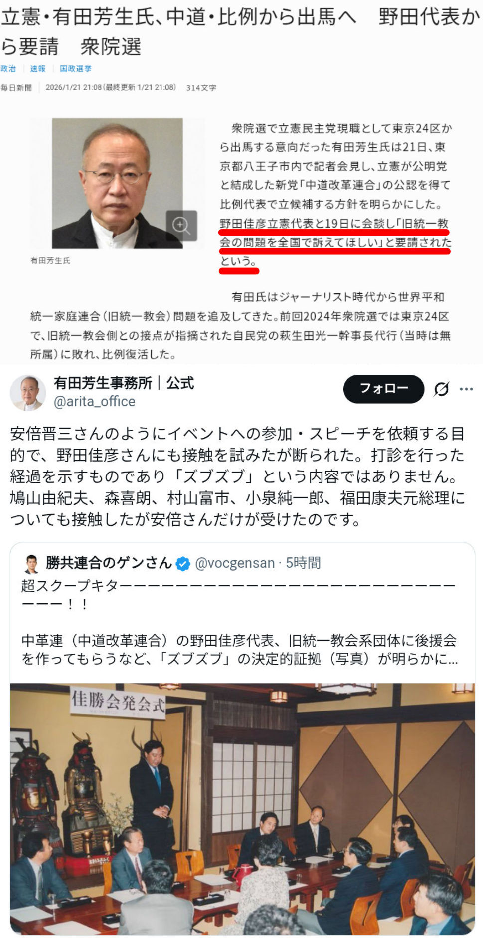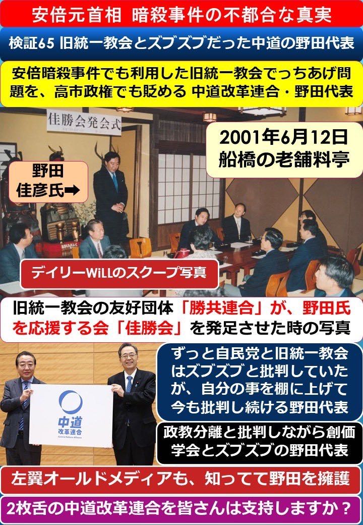 | … | 237無念Nameとしあき26/01/26(月)21:24:29No.1382916779+佳勝会とかいう統一の組織に支援されてたんじゃ統一と一心同体と言われても仕方ないね野田さん |