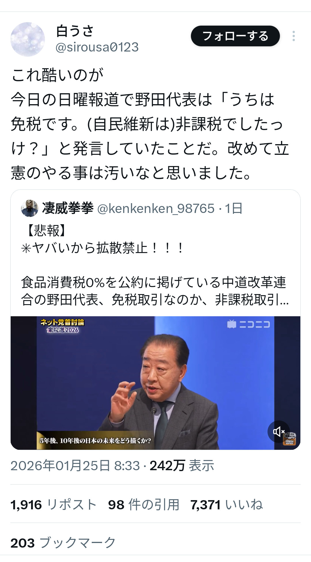| … | 37無念Nameとしあき26/01/26(月)20:26:26No.1382901117そうだねx4 1769426786653.jpg-(352280 B) >野田の問題はこの体たらくで「自民と統一の繋がりを争点に戦います」って言ってる事だよ |