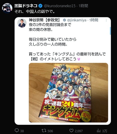 | … | 37無念Nameとしあき26/01/26(月)20:28:12No.1382901554+ 1769426892758.jpg-(1916860 B) キングダムは登場キャラが全員日本語をしゃべっているから勘違いするのはしょうがない |