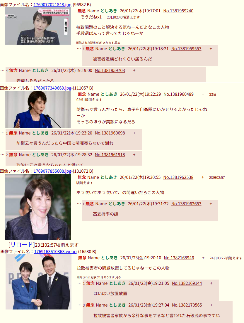 | … | 199無念Nameとしあき26/01/26(月)21:30:34No.1382918470そうだねx3>ここ数日安倍殺しスレ立たないよな |