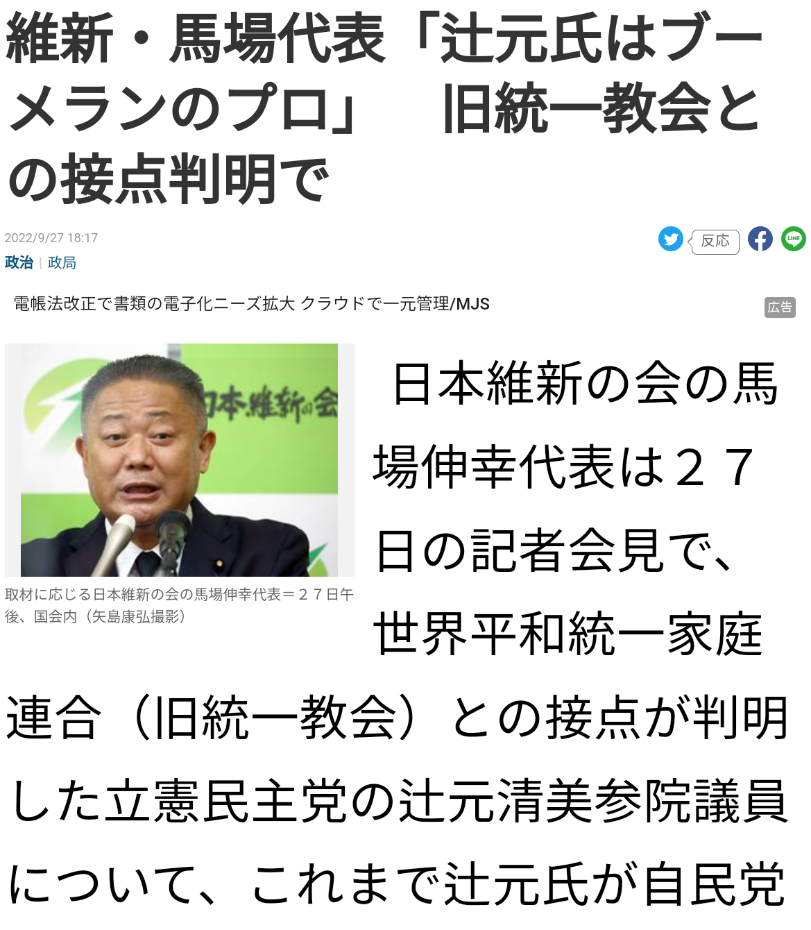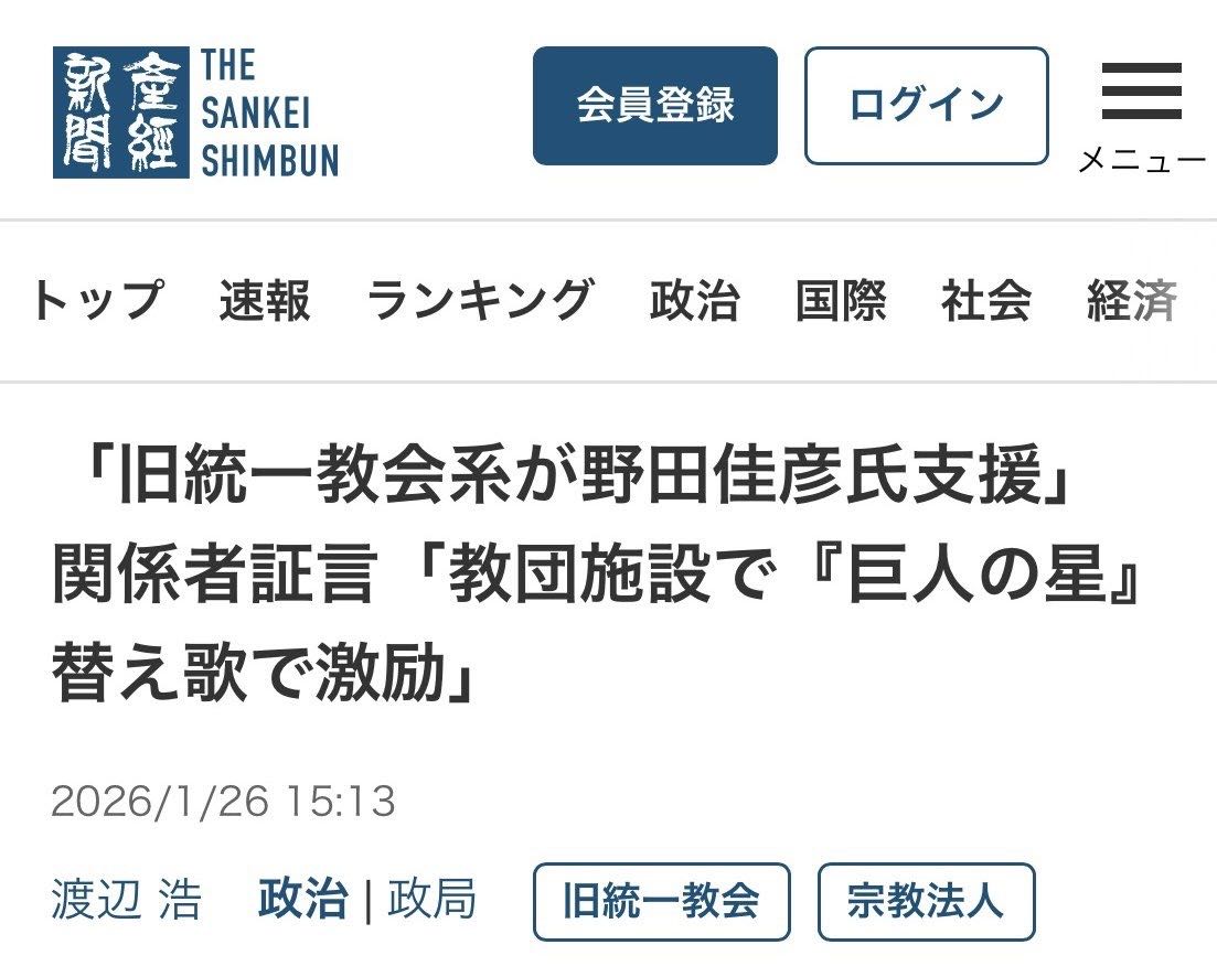 | … | 292無念Nameとしあき26/01/26(月)22:02:26No.1382927496+「旧統一教会系が野田佳彦氏支援」 関係者証言「教団施設で『巨人の星』替え歌で激励」 |