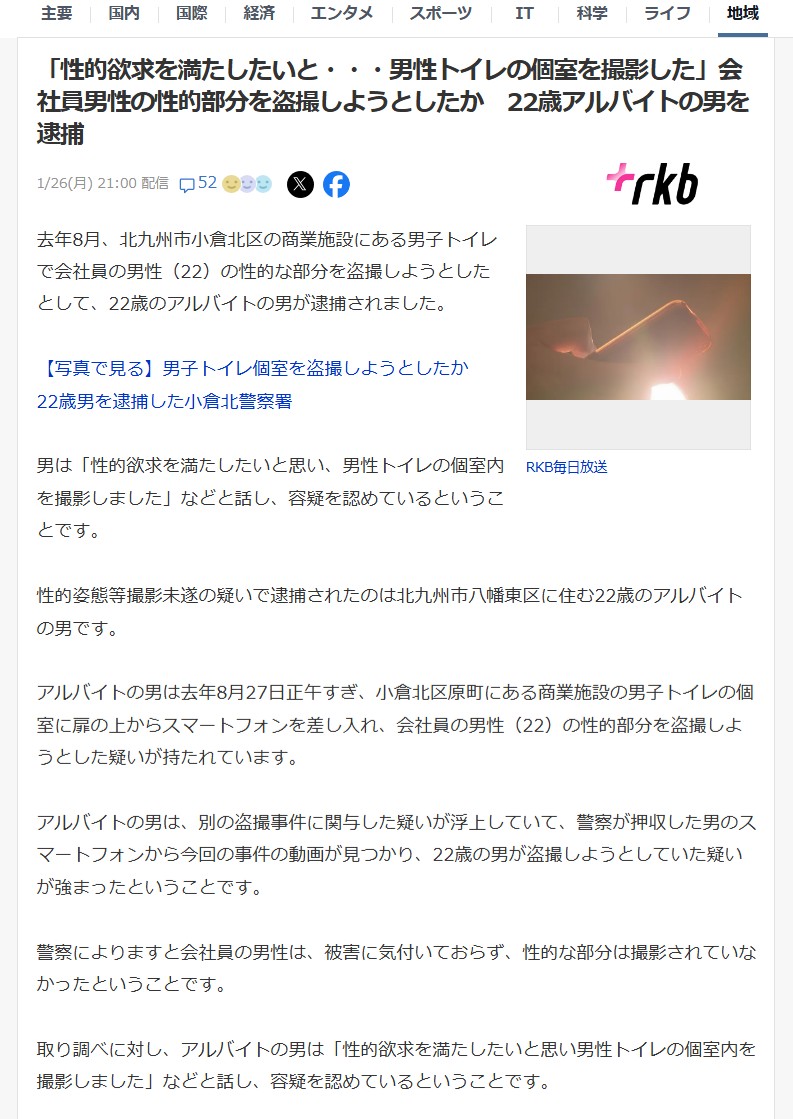 | … | 17無念Nameとしあき26/01/27(火)03:49:26No.1382975929+>「性的欲求を満たしたい」 スマホでトイレ盗撮した男(22)逮捕!!卑劣な盗撮は許すな!! |