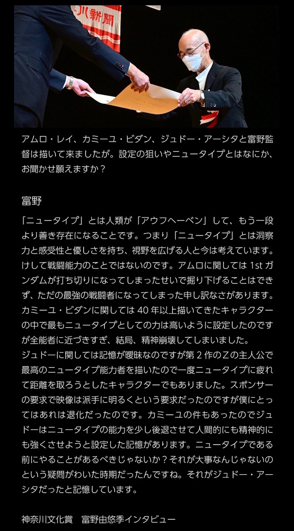 | … | 31無念Nameとしあき26/01/27(火)04:49:45No.1382977185+アムロに関しては1stガンダムが打ち切りになってしまったせいで掘り下げることはできず、ただの最強の戦闘者になってしまった申し訳なさがあります。カミーユ・ビダンに関しては40年以上描いてきたキャラクターの中で最もニュータイプとしての力は高いように設定したのですが全能者に近づきすぎ、結局、精神崩壊してしまいました。 |