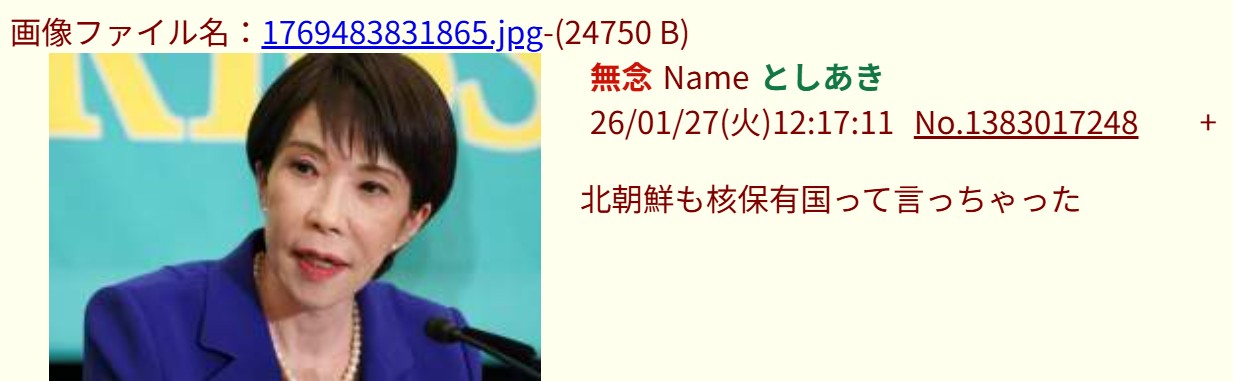 | … | 83無念Nameとしあき26/01/27(火)12:23:01No.1383018348+>反自民のゴミカスニートの皆さん |