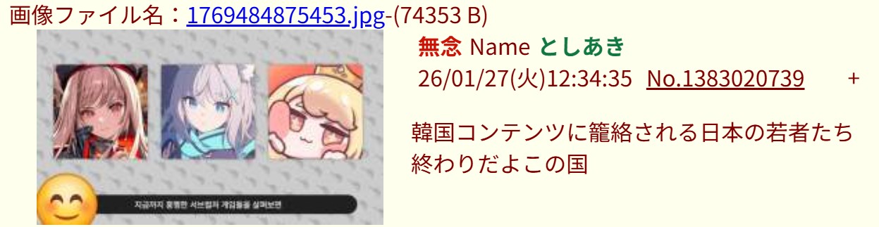 | … | 66無念Nameとしあき26/01/27(火)12:19:26No.1383017645+さっすが朝鮮バカウヨの河村ソンキさんだぜ! |