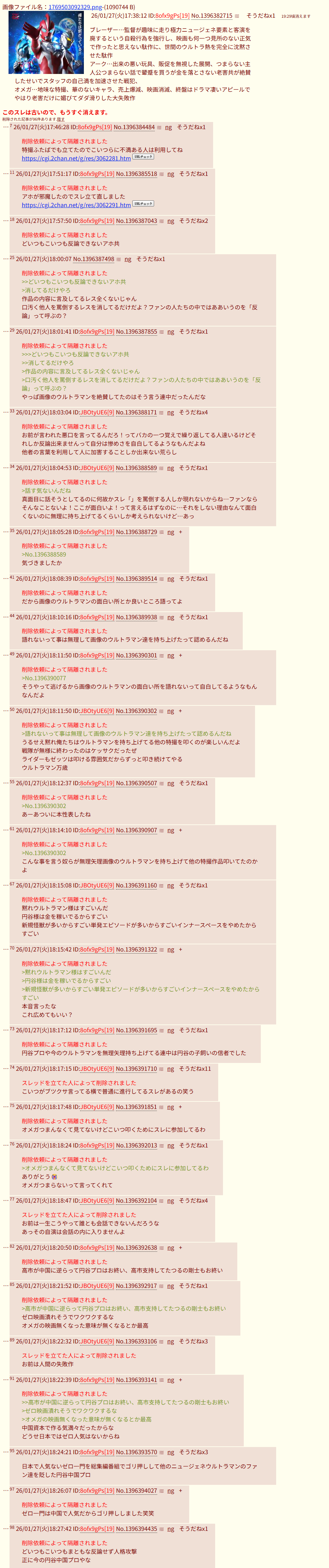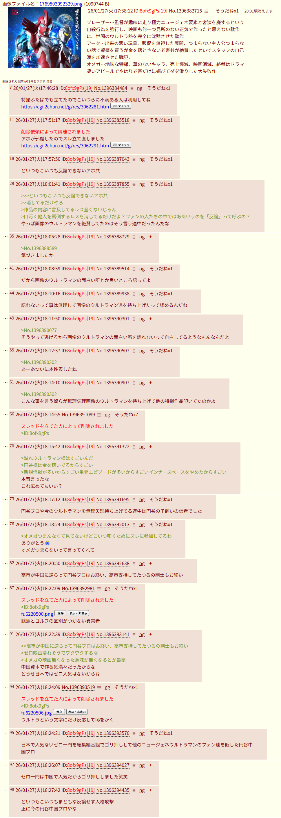 | … | 115無念Nameとしあき26/01/27(火)19:40:06No.1383098510+>お前らが酔いしれてる円谷プロは中国でおま国やってるだろ |
