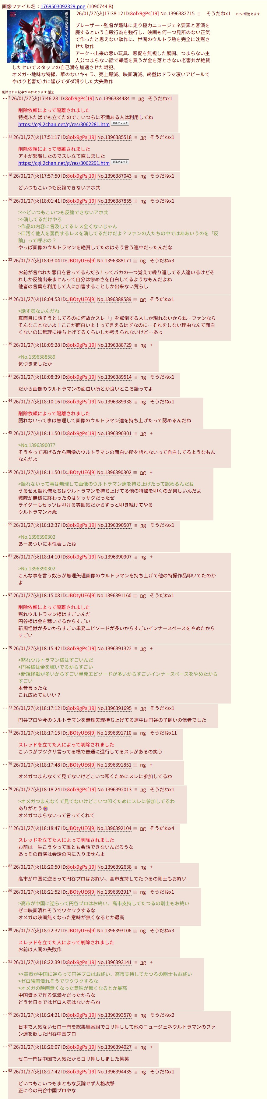 | … | 114無念Nameとしあき26/01/27(火)19:39:27No.1383098318+>円谷プロも脳死な信者囲って偉そうにゴミ作を3作も連破してたけど失敗したね |