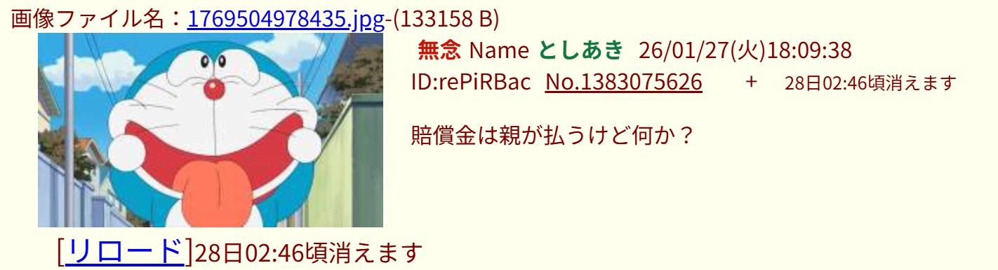 | … | 2無念Nameとしあき26/01/27(火)18:12:01No.1383076133そうだねx12 1769505121072.jpg-(99994 B) >賠償金は親が払うけど何か? |
