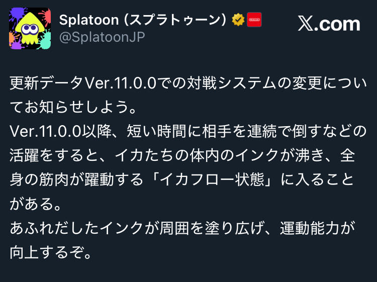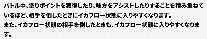 | … | 77無念Nameとしあき26/01/27(火)18:45:48No.1383083842+>イカフロー状態になったり、イカフロー状態の継続時間が延長したりすると、プレイヤーの足元が自分のインクで塗られます。 |