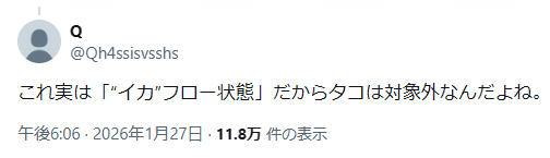 | … | 16無念Nameとしあき26/01/27(火)18:36:27No.1383081606+イカフロー状態は、放出された脳内物質により、イカたちの体内のインクが沸き、全身の筋肉が躍動している状態です。 |