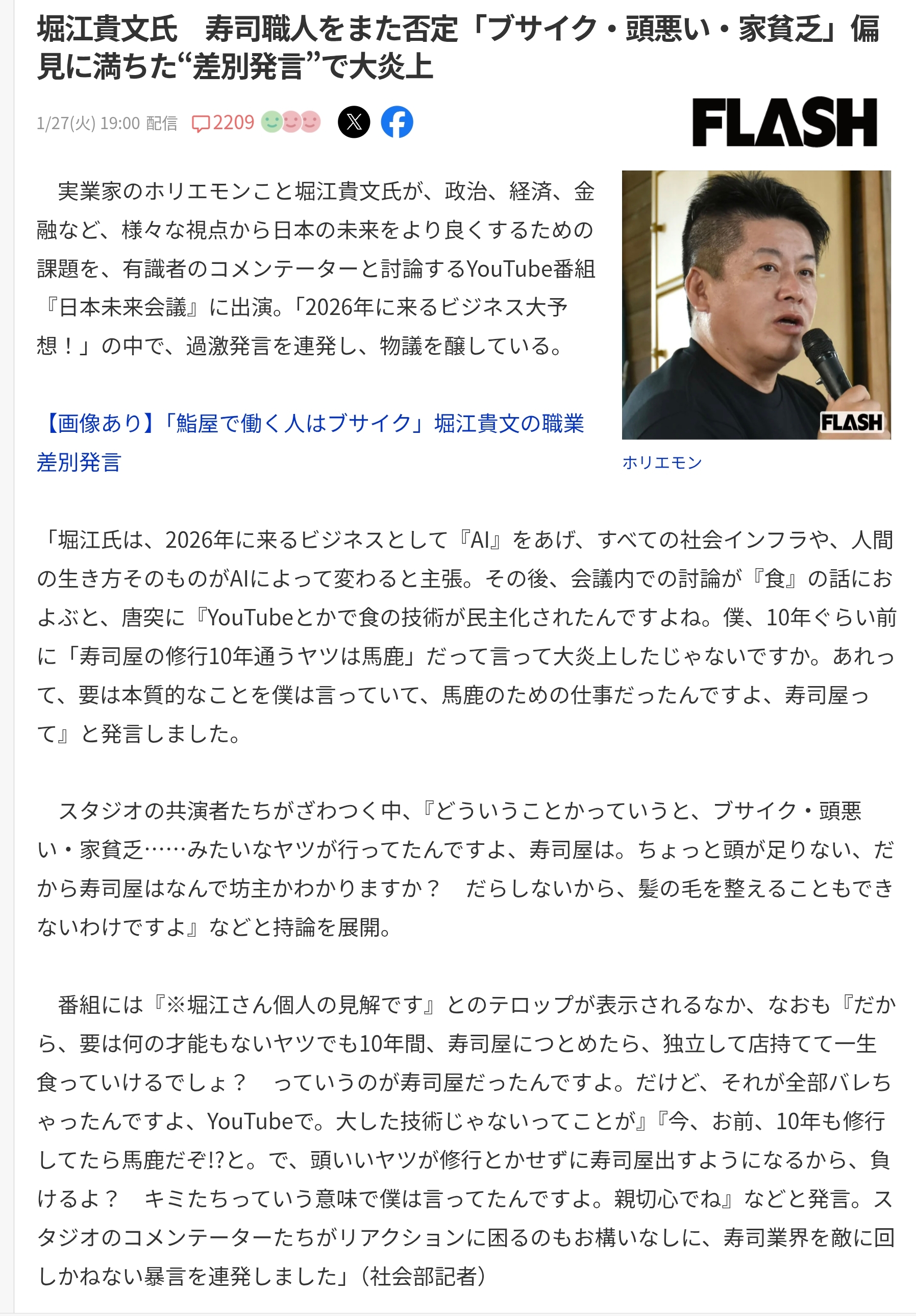 | … | 1無念Nameとしあき26/01/28(水)06:56:21No.1383198192そうだねx4>ホリエモン、正論を述べて炎上してしまう |